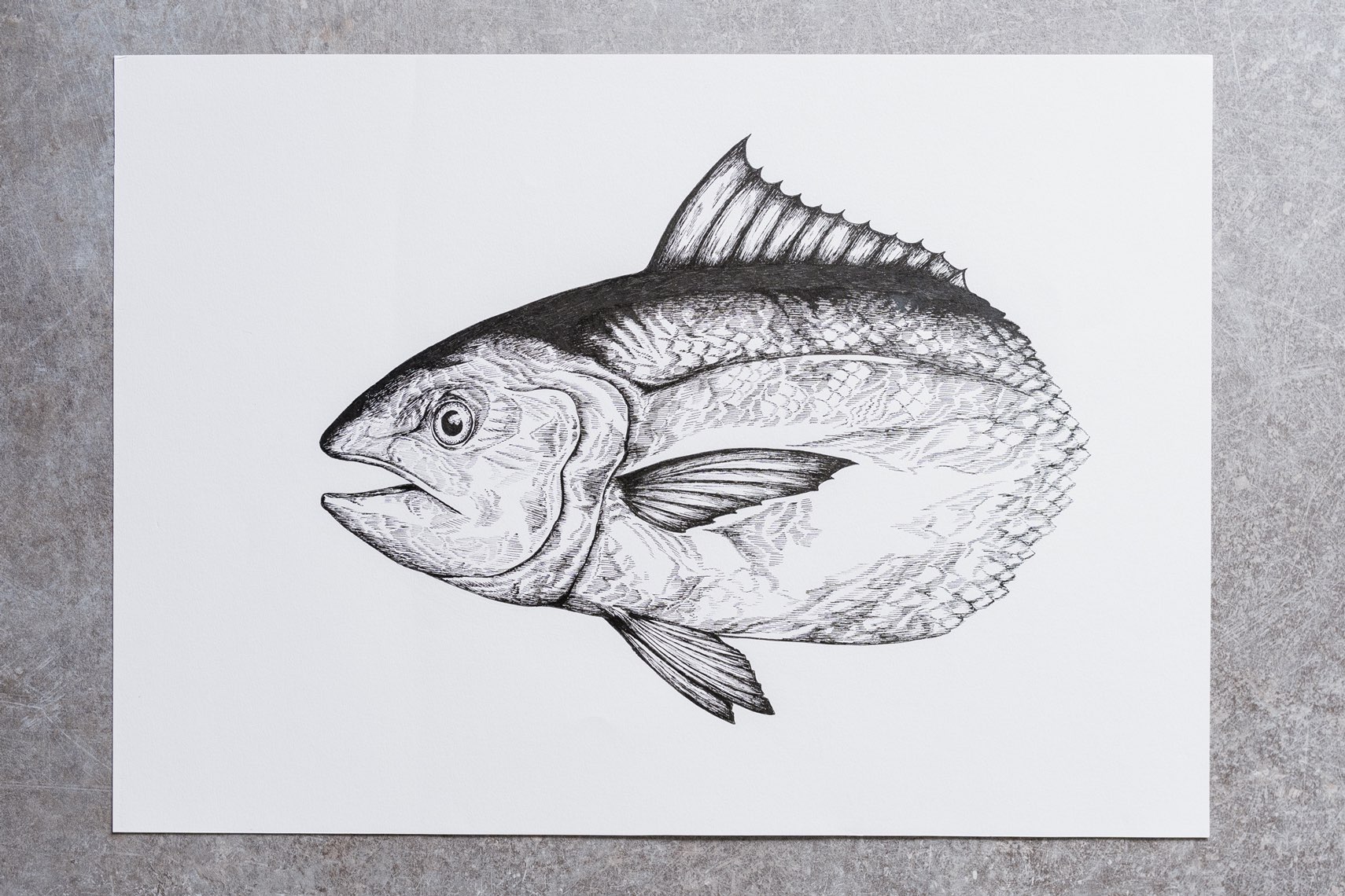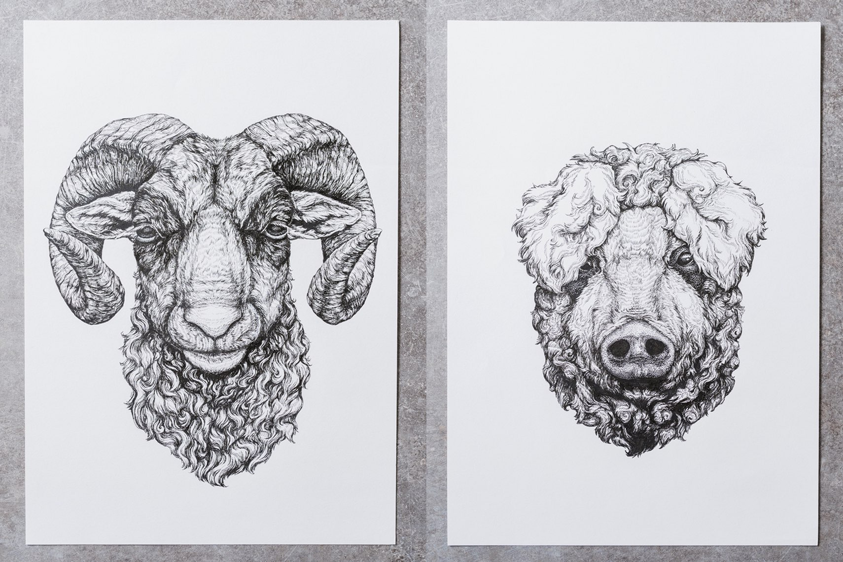 After approving the conceptual solution for the identity and the direction in which we envisioned the illustration, an illustrator was selected to collaborate on the project. In collaboration with the client, photographs of animals were chosen, representing specific breeds raised for these meat products (e.g., the Istrian pig of the Mangulica breed). Subsequently, in collaboration with the illustrator, pencil sketches were first made to define the position of the head, eye height, and sizes of other elements in the composition, as well as the proportional sizes of illustrations of different animals, etc. The illustrator then created original illustrations, hand-drawn on paper, in enlarged dimensions (on A3 format). Afterward, they were scanned, reduced to the required size, further processed for use in design, and integrated into the identity.