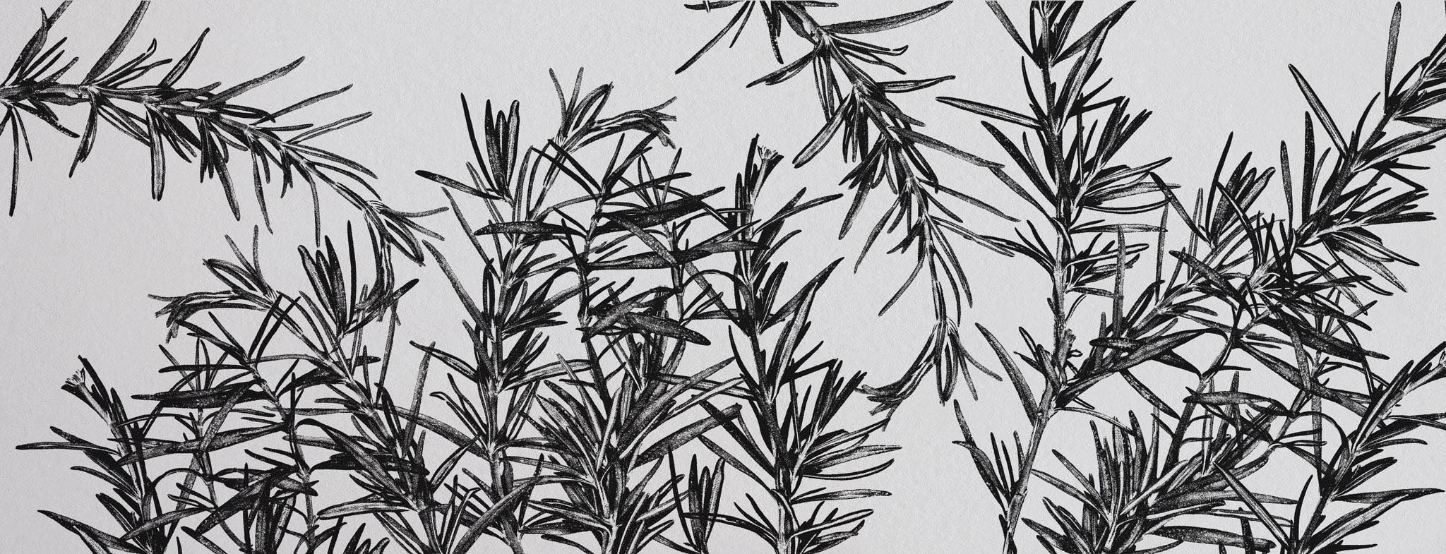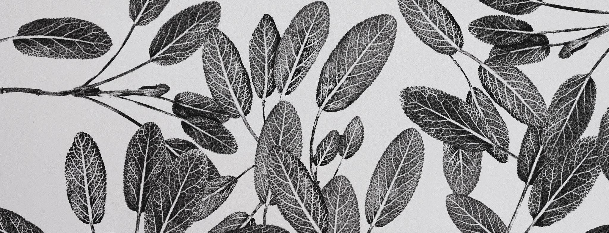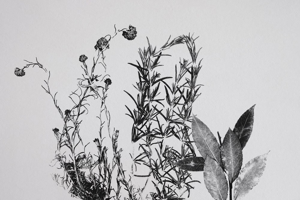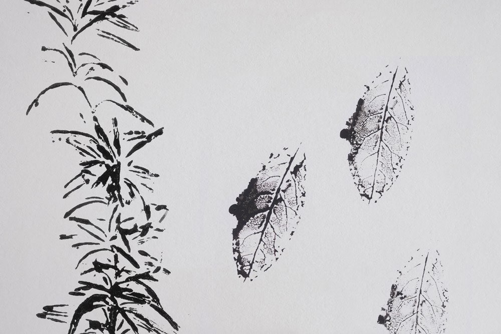 The second technique involves imprinting plants on paper or canvas. We apply color to the entire plant body using a rubber roller, and then carefully transfer the plant onto paper as a print. These prints are not particularly precise but create very interesting shapes of illustrations that clearly show they originated from immersion in liquid. This form of plant transfer is ideal for use within the identity of product lines for bathing.
