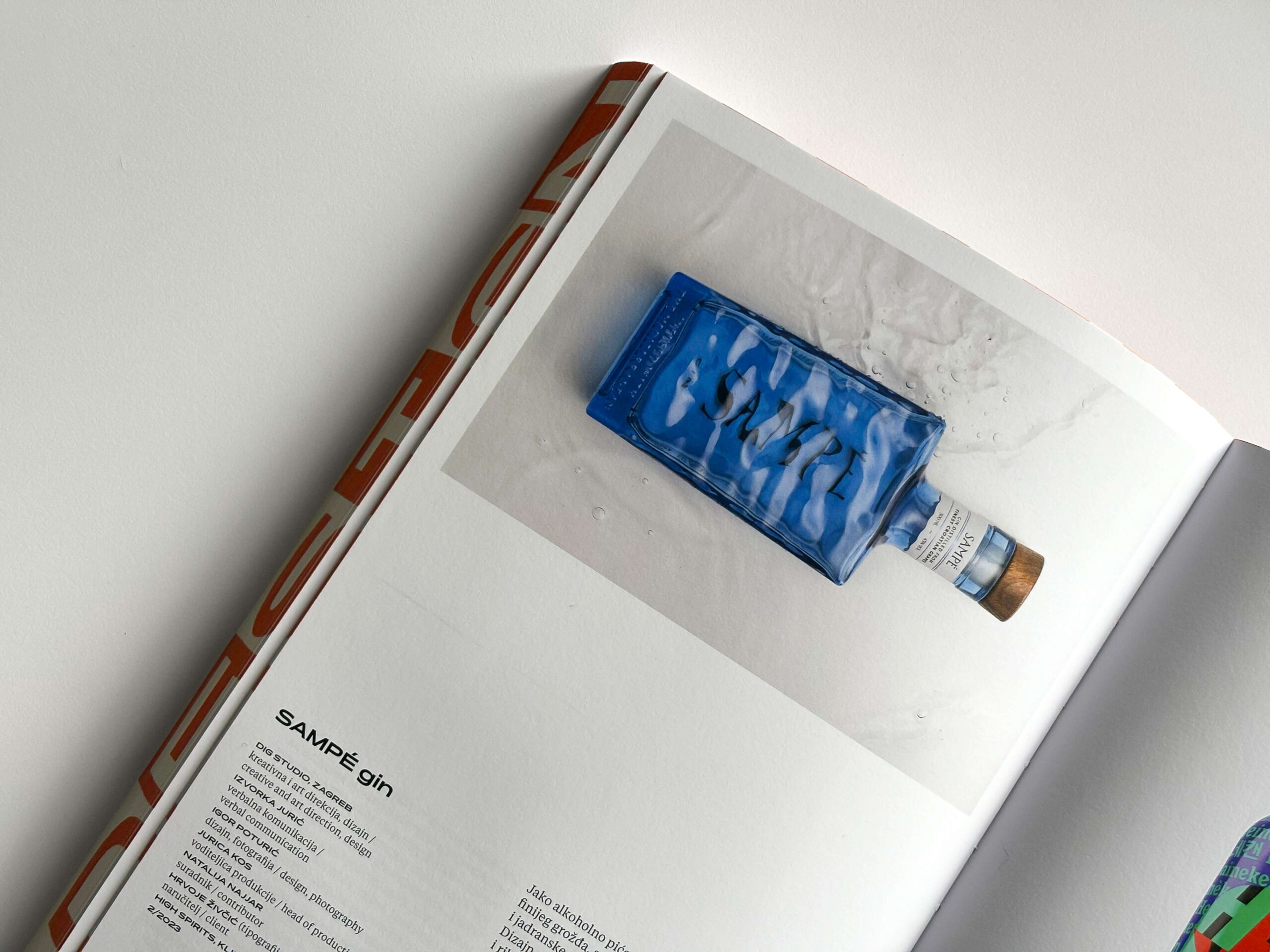Sampé gin – A bottle design inspired by the sea surface, where the brand name appears submerged in liquid behind the wavy glass structure.