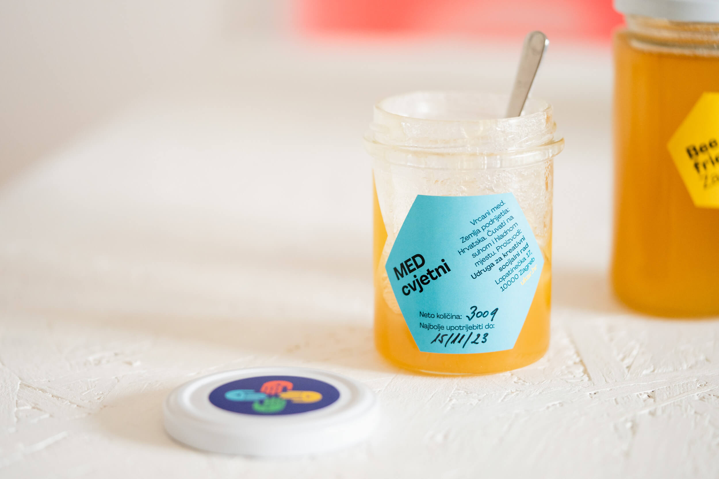 The modular label system for honey consists of three basic labels, each in a different color from the Association’s identity, intended for three different packaging sizes, as well as labels with the Association’s logo. On each basic label, the weight and expiration date are handwritten, and for donors of the ‘Bee-friendly Zagreb’ project, an additional label with the project’s name is added.